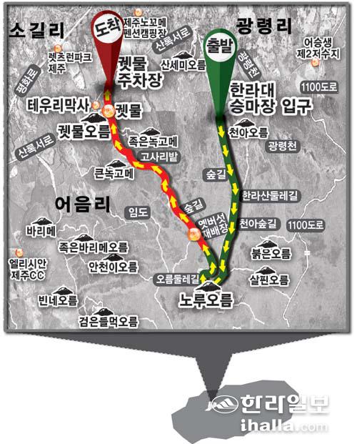 노로오름, 그 이름처럼 노루(노리)가 뛰놀던 목가적인 오름이었으나, 4·3사건과 토벌의 과정에서 피어린 전투를 치른 항쟁의 오름이었다. 1949년 3월 말쯤, 제주도지구전투사령부(사령관 유재흥 대령)는 적악, 노로악, 한대악을 연하는 선을 차단해 무장대를 포착·섬멸하라는 작전명령을 내린다. 2연대 1대대(대대장 임부택)가 이 지역 토벌에 투입됐다. 한대오름에 피신했던 피난민과 무장대는 위쪽에 위치한 노로오름으로 이동할 수밖에 없었다.