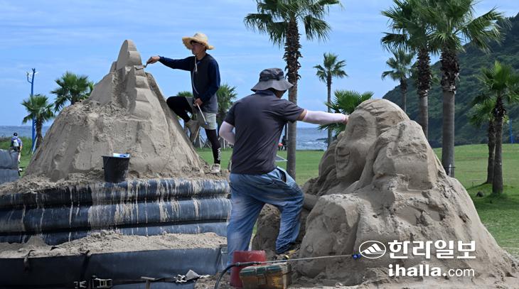 [한라일보] 여전히 무더운 날씨가 이어진 29일 제주시 함덕해수욕장 백사장에서 조각가들이 모래조각을 하고 있다. 강희만기자