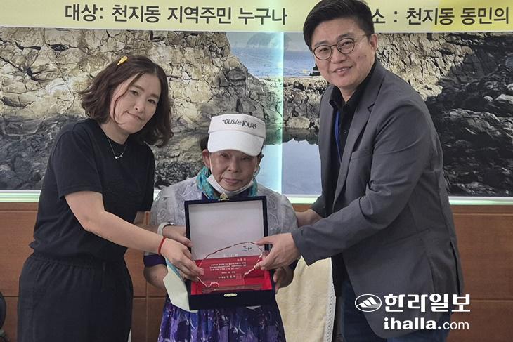 지난달 30일 서귀포시 천지동에서 최연자 동민에게 '선행동민' 감사패를 전달하고 있다. 천지동 제공