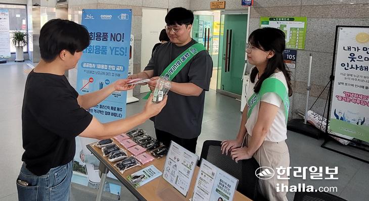 2일 서귀포시 직원들이 1청사 출입구에서 1회용 컵 반입 금지 등을 안내하는 캠페인을 벌이고 있다. 서귀포시 제공