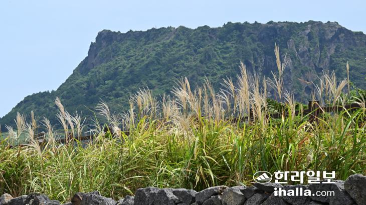 [한라일보] 폭염이 한풀 꺾인 2일 서귀포시 성산일출봉 진입로에 억새꽃이 피어 시선을 사로잡고 있다. 강희만기자