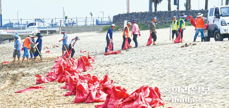 [한라일보] 2일 제주시 이호테우해수욕장에서 바다지킴이들이 해안 정화작업을 진행하고 있다. 이상국기자