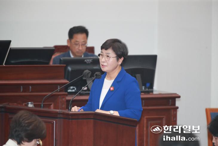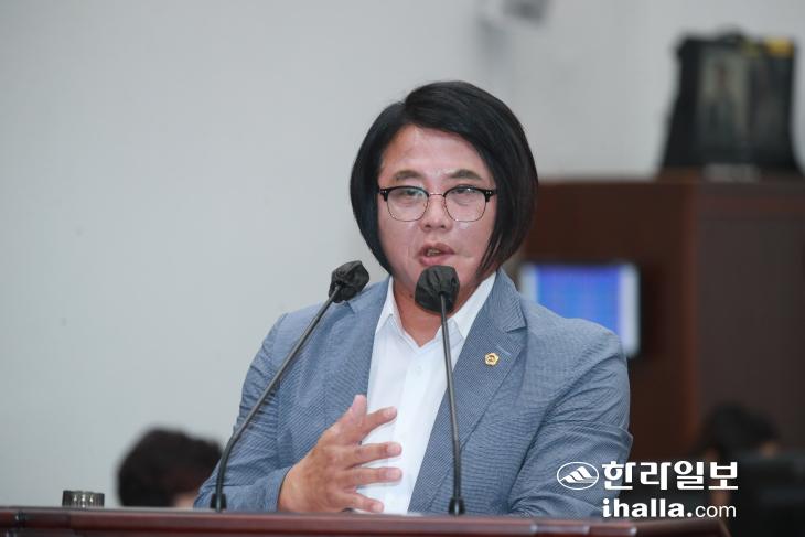 강성의 의원이 3일 도의회 임시회 도정질문에서 오영훈 지사에 질의하고 있다. 사진=도의회