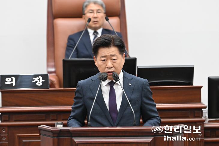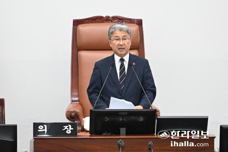 이상봉 의장이 4일 제주도의회 도정질문에서 오 지사의 '지적 수준' 언급 발언에 대해 유감을 표하고 있다. 사진=제주도의회