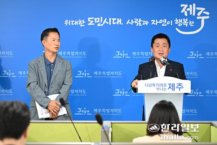 제주 제2공항 기본계획 고시에 따른 입장과 향후 추진계획 밝히는 제주자치도 김형섭 공항확충지원단장(오른쪽). 강희만 기자