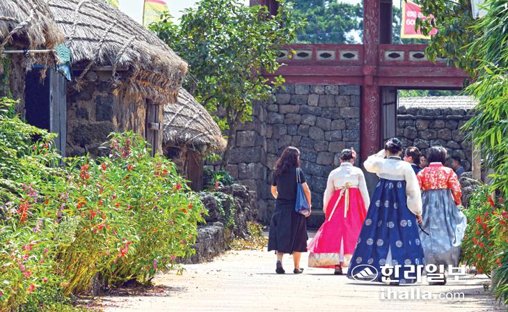 [한라일보] 9일 서귀포시 표선면 성읍민속마을을 찾은 관광객들이 고운 한복을 입고 마을 탐방에 나서고 있다. 강희만기자