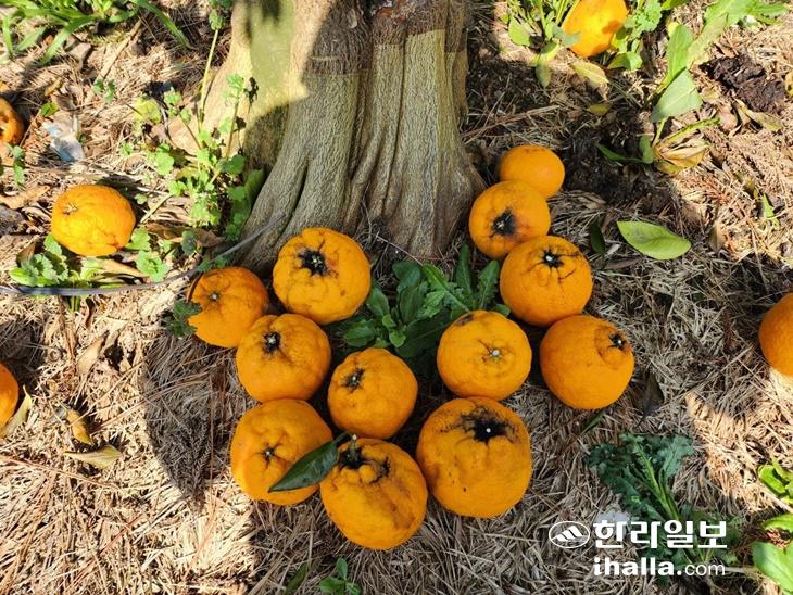 노지 한라봉 꼭지 부분 썩음과 낙과 피해. 서귀포시 제공