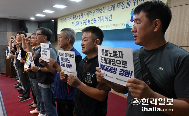공공운수제주지역본부와 정의당 제주도당은 11일 오전 제주도의회 도민카페에서 돌봄노동자의 지위와 권리보장을 위한 주민조례 청구운동을 시작하겠다고 밝혔다. 강희만기자