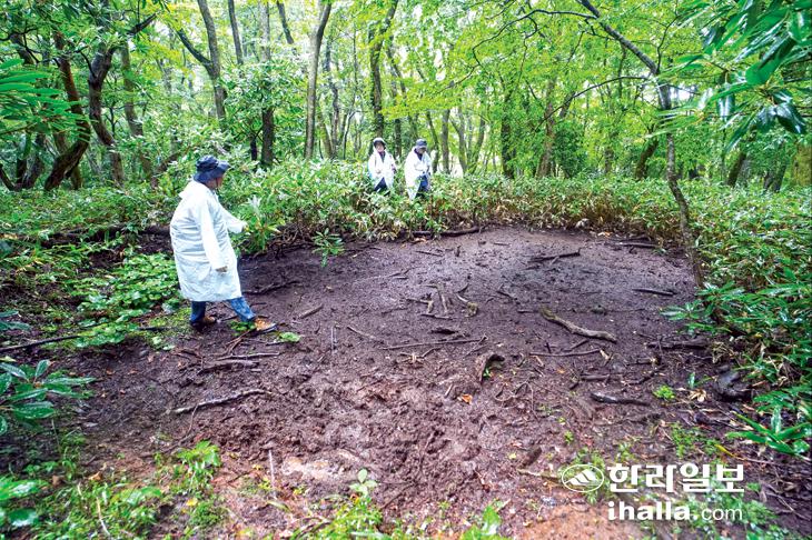 화전 특별취재팀이 능화오름 일대를 찾은 것은 지난 8월 14일이다. 지난해 11월에 이은 조사다. 취재팀은 정상부 아래 분지에서 화전 마을 주민들의 생활상을 보여주는 집터와 흔적들을 찾아냈다. 사람들이 떠나고 잊혀진지 1세기 이상 지났지만 화전민들의 흔적은 생생했다. 주거·생활상을 보여주는 집터와 통시(화장실), 빗물을 모으고 사용했던 인공연못(집수정) 등이 뚜렷하게 잘 남아있다. 문헌으로 전해지는 능화동 화전 마을 현장이 드러났다.