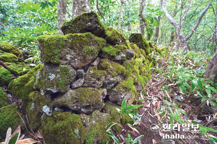 한라산 고지대에 위치한 조릿대 속 농화동 화전 마을의 집터. 직사각형 구조로 10여 평 정도 된다.