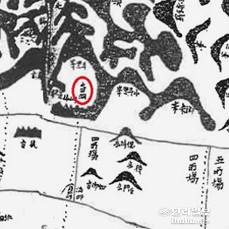 '제주군읍지 제주지도' 상의 능화오름 화전동(붉은 원).