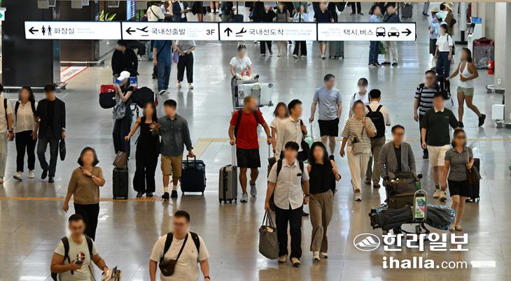 [한라일보] 12일 제주국제공항 도착 대합실이 제주에서 추석연휴를 보내려고 내려온 관광객들로 북적이고 있다. 강희만기자