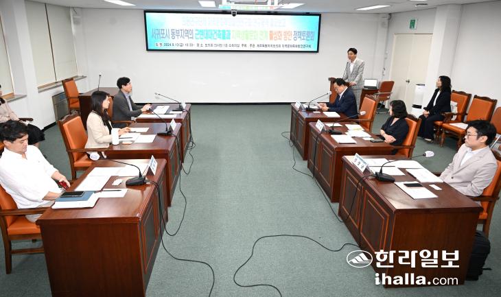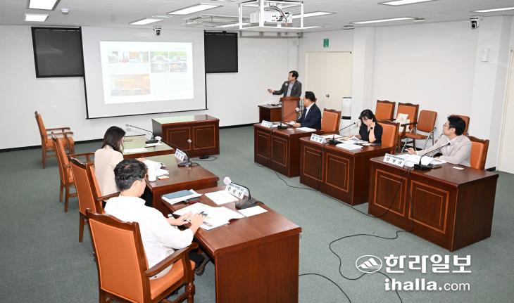 제주특별자치도의회 의원연구단체인 지역문화특화발전연구회가 13일 제주도의회 의사당 소회의실에서 '서귀포시 동부지역 근현대 건축물과 지역생활문화 연계 활성화 방안'을 주제로 정책토론회를 열고 있다. 제주도의회 제공