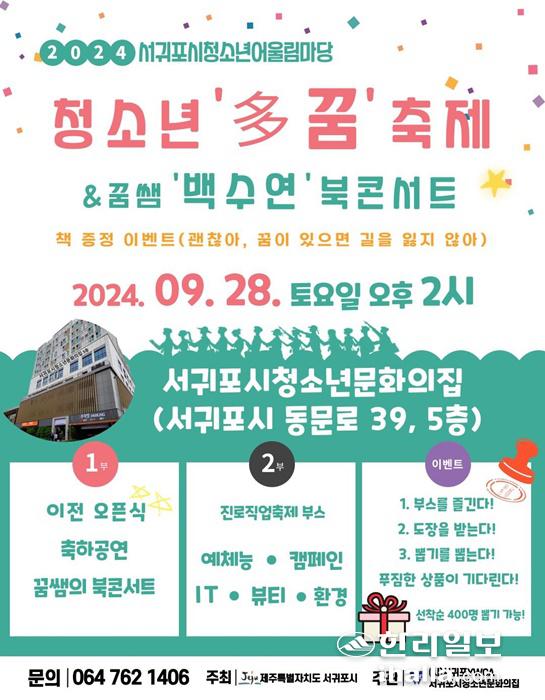 [한라일보] 지난 9월 제주 서귀포시 중앙동 공공복합청사에 새롭게 둥지를 튼 서귀포시청소년문화의집 이전 기념식을 겸해 청소년들이 진로를 탐색할 수 있는 행사가 열린다. 서귀포시 주최, (사)서귀포YWCA(회장 김정미) 주관으로 이달 28일 오후 2시부터 시작되는 '2024 서귀포시청소년어울림마당-청소년 다(多) 꿈 축제'다.
