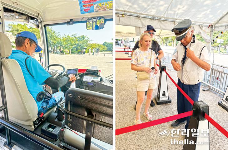 일본 오사카 대표적 문화관광지인 오사카성의 셔틀 운전원(왼쪽)과 안내 매표소 주변 경비 보안을 담당하는 직원. 이들 모두 60세가 훌쩍 넘었다. 송문혁 기자