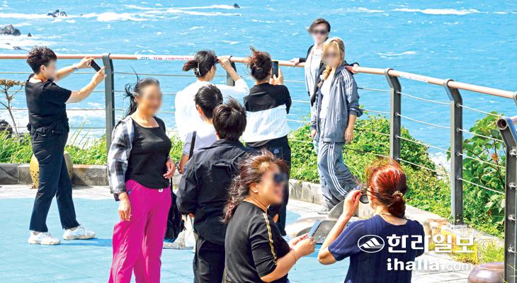 [한라일보] 23일 제주시 도두동 무지개해안을 찾은 중국인 관광객들이 바다를 배경으로 사진을 찍고 있다. 강희만기자