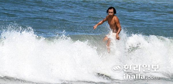 [한라일보] 23일 제주시 이호동 이호해수욕장을 찾은 서퍼가 강한 바람과 높은 파도를 즐기고 있다. 강희만기자