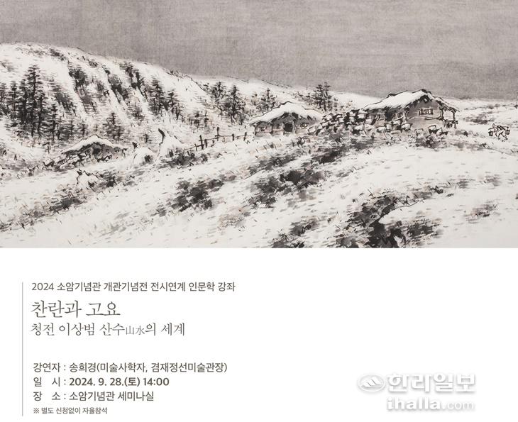 [한라일보] 제주 서귀포시 소암기념관은 현재 진행 중인 기획전과 연계해 인문학 강좌를 연다. 오는 28일 오후 2시 소암기념관 세미나실에서 개최되는 '찬란과 고요, 청전 이상범 산수의 세계' 강좌다.