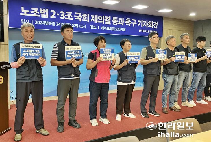 민주노총 제주본부는 24일 제주도의회 도민카페에서 '노조법 2·3조 국회 재의결 통과 촉구' 기자회견을 열었다.