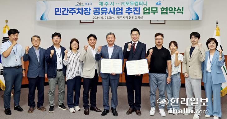 [한라일보] 제주시가 시청사의 주차난을 일부 해소하기 위해 민간 주차장을 공유하는 사업을 추진한다. 이를 위해 24일 (주)모두컴퍼니(대표 김동현)와 민간 주차장 공유 사업 업무 협약을 체결했다.