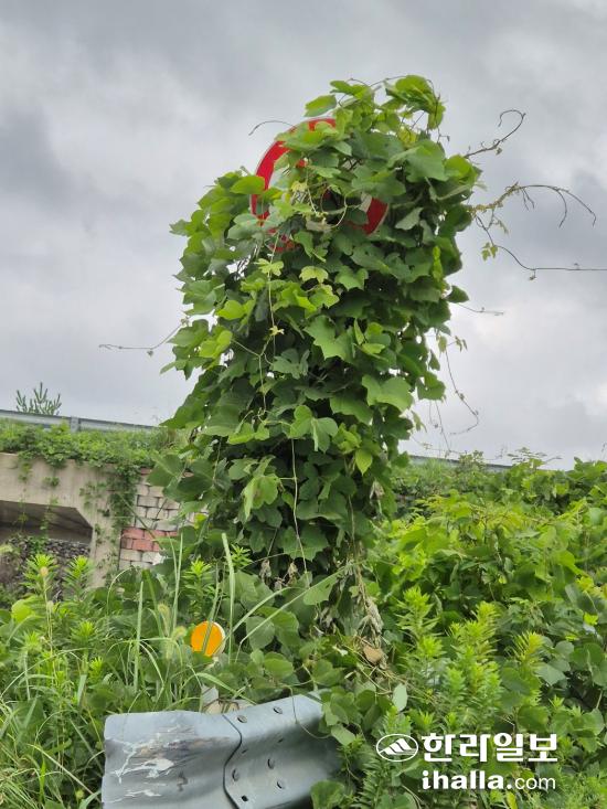 제주시 오등동에 있는 제주시새활용센터 인근 도로 표지판이 덩굴류에 가려져 있다.