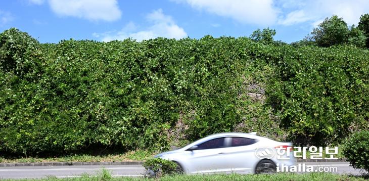 지난 24일 제주 중산간서로 도로변을 덩굴류가 뒤덮고 있다. 강희만기자