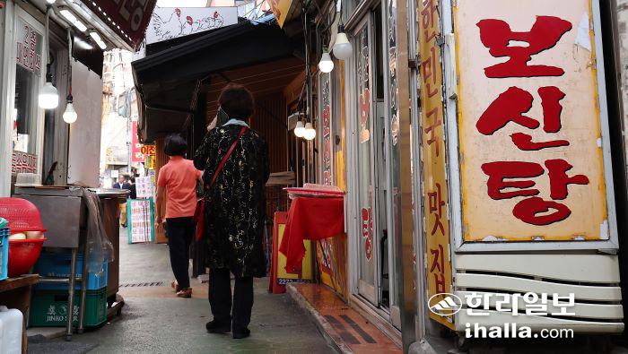 농림축산식품부가 '개식용종식 기본계획'을 발표한 26일 서울의 한 보신탕 집앞에 시민들이 오가고 있다. 연합뉴스