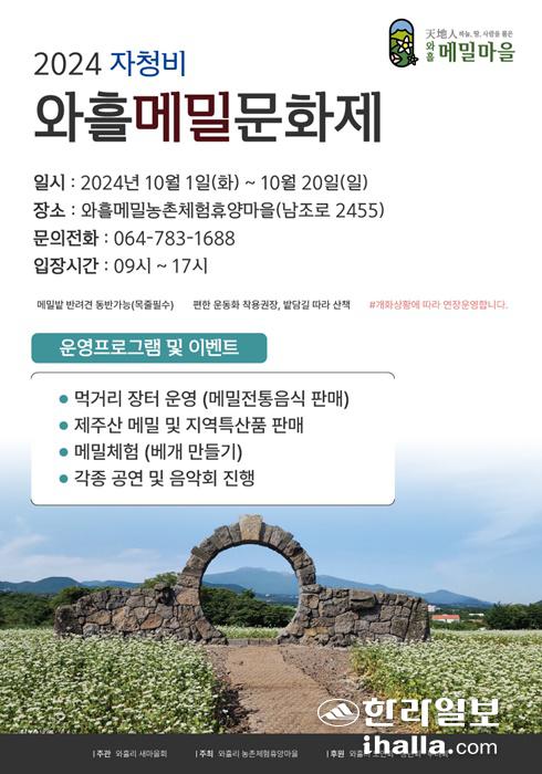 이번 행사는 10월 1일부터 20일까지 5만㎡(1만 5000여 평) 규모의 메밀밭이 조성된 와흘메밀농촌체험휴양마을(남조로 2455) 일원에서 진행된다. 메밀꽃밭 걷기, 메밀 전통 음식·제주산 메밀·특산물 판매, 메밀 베개 만들기 체험, 공연 등이 잇따른다.