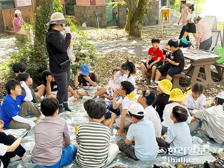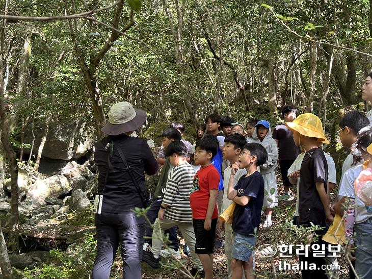 한라산 둘레길 안쪽에 있는 계곡에서 아이들이 해설사 설명에 집중하고 있다.