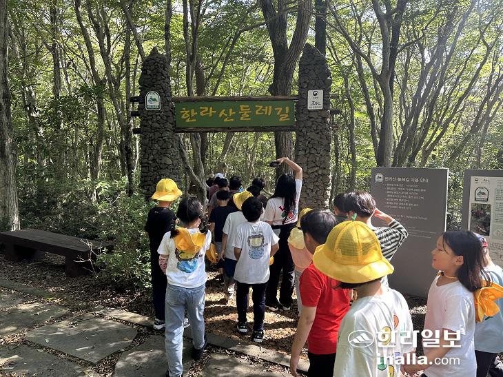 한라산 둘레길 간판이 적힌 입구로 아이들이 들어가고 있다.