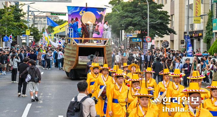 [한라일보] 신명난 '가을잔치', 제63회 탐라문화제의 막이 올랐다. 본격적인 축제의 첫날인 지난 5일엔 관덕정에서 탑동해변공연장까지 흥겨운 풍물놀이와 퍼포먼스로 물들인 탐라퍼레이드가 도민과 관광객의 눈과 귀를 사로잡았다. 제주시 산지천변을 중심으로 원도심을 거대한 민속문화예술축제장으로 변모시킬 탐라문화제는 오는 9일까지 이어진다. 강희만기자