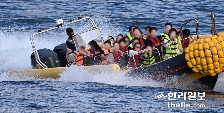 [한라일보] 7일 제주시 우도면 우도봉 인근 해안에 쾌속선을 탄 관광객들이 빠른 속도를 즐기고 있다. 강희만기자