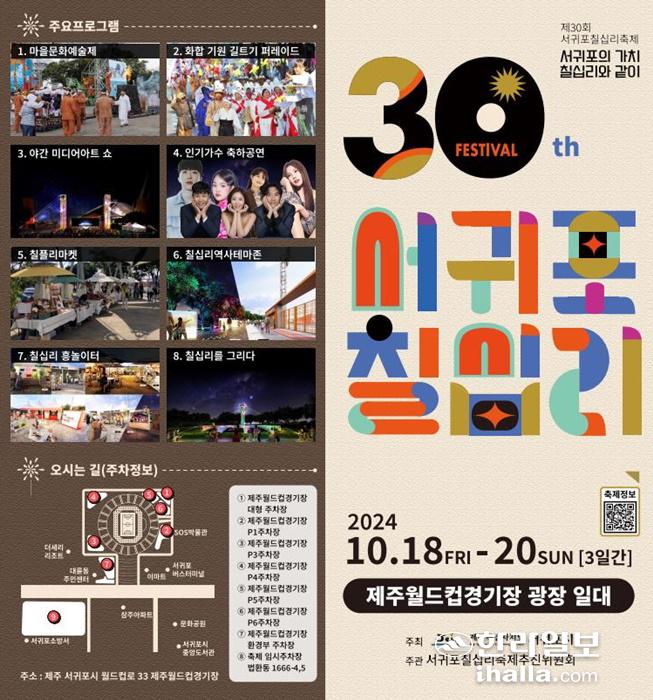 [한라일보] 1995년 9월 천지연폭포 광장에서 1주일 일정으로 첫발을 뗐던 서귀포칠십리축제. 올해로 어느덧 30회째를 맞았다. 코로나19가 유행하던 시기에도 멈추지 않았던 칠십리축제가 '서른 살'을 기념해 '서귀포의 가치, 칠십리와 같이'라는 슬로건 아래 축제의 어제를 돌아보고 미래를 그려보는 흥겨운 마당을 펼친다. 제주 서귀포시가 주최하고 서귀포칠십리축제추진위원회(위원장 우기남)가 주관해 이달 18일부터 20일까지 3일간 제주월드컵경기장 광장 일원에서 제30회 서귀포칠십리축제를 연다.