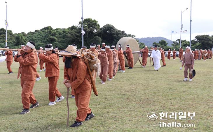 제주도 무형유산으로 지정된 서귀포시 안덕면 덕수리의 '방앗돌굴리는노래' 재현 장면. 덕수리마을회 제공