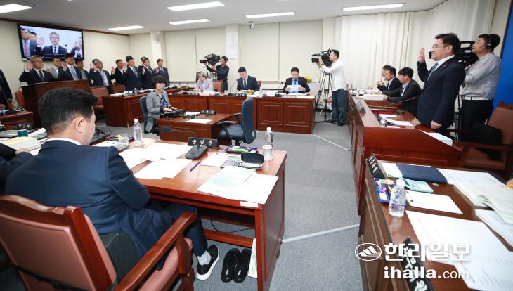 11일 제주도의회 환경도시위원회 소관 '제주도 행정사무감사'에 출석한 진명기 행정부지사 등 공무원들이 선서를 하고 있다. 제주도의회 제공