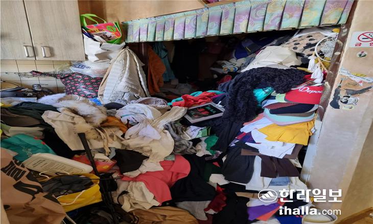제주도내 종합사회복지관 5곳이 제주사회복지공동모금회의 지원을 받아 운영 중인 '더불어 산다'는 중장년 1인가구의 자립 지원 사업이다. 복지 현장에선 단순히 고독사를 막는 것에서 벗어나 이들을 다시 사회 속에 설 수 있도록 지원하는 사업이 계속돼야 한다는 목소리를 낸다. 사진은 제주시 아라동 C씨가 은둔 상태였을 당시 집안의 모습. 각종 옷가지와 쓰레기가 뒤엉켜 있다.
