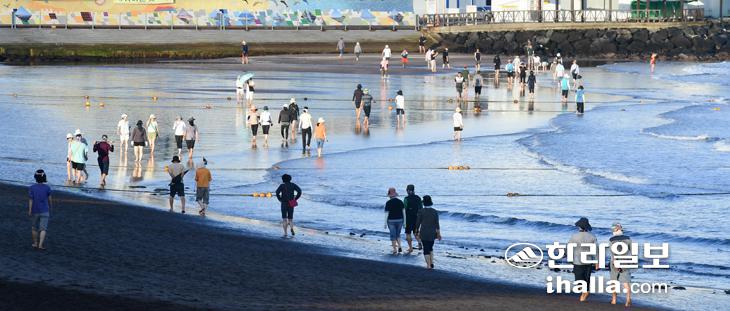 제주삼양해수욕장에서 맨발걷기를 하는 도민들. 한라일보DB