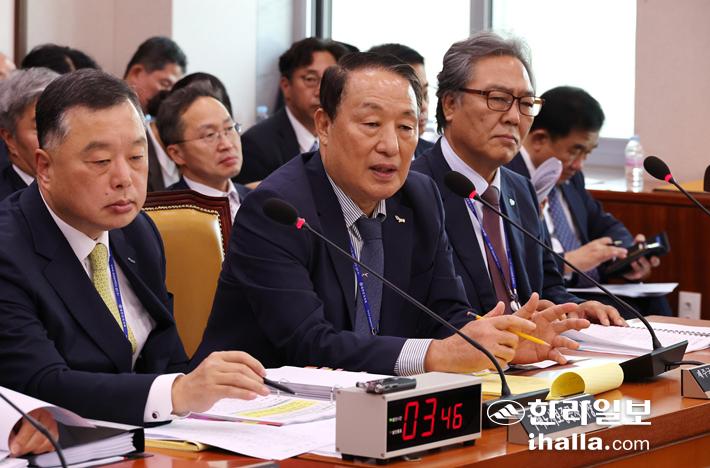 16일 오후 속개된 국회 국토교통위원회의 한국부동산원, 주택도시보증공사 등의 국정감사에서 양영철 제주국제자유도시개발센터 이사장(왼쪽 두번째)이 의원 질의에 답변하고 있다. 연합뉴스