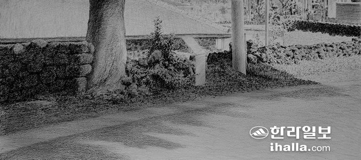 빛을 강조하기 위하여 불가피하게 색을 빼는 경우가 있다면 이런 경우일 것이다. 오랜 세월을 마을의 역사와 함께 해온 팽나무 그림자를 그리려 하였다. 완만한 오르막이자 내리막 경사를 지닌 아스팔트 길 옆에 건장한 모습으로 서있는 나무기둥에 비하면 전봇대는 빈약하기 이를 데 없다. 집담과 밭담의 차이를 한 화면에서 이렇게 배치되어 드러나게 하는 경우도 쉽지가 않다. 채색 욕구를 억누르며 끈질기게 부여잡고자 한 것은 흑백사진처럼 오랜 전 느낌을 간직한 세월의 빛이다. 밭담이 보유한 명암의 요소가 욕심을 내서 그리게 된 연유이기도 하거니와 오른쪽 밭에 햇살을 받는 밭의 밖과 햇살을 받지 않은 밭의 안쪽 밭담이 굽이돌아가는 큰길로 인하여 발생되는 양면성이다. 그냥 단순하게 바라보면 의미를 느끼지 못하는 것들이 이렇게 합창단처럼 자기만의 고유한 특색을 가지고 모여들면 빛이라고 하는 엄숙하고 화려한 공통의 목적을 노래하는 힘을 보유하게 된다는 사실을 느끼게 된다. 이색적으로 바라보게 된 것은 나무가 돌에 기댄 것이 아니라 돌이 나무에 기댄 모습이다. 팽나무 기둥에 기댄 돌담이 상징하는 바 무엇이랴. 마을의 역사, 조상님들의 굳건한 정신문화가 오늘날 쌓아올린 돌담과도 같은 노력들이 무너지지 않도록 해준다는 의미를 발견하고 그린 것이다. 분명 저 굵은 기둥이 없으면 쓰러질 돌담. 아니, 기둥을 믿고 기대서 쌓은 모습이다. 시사하는 바 크다. 지나치지 않더라도 현실 속에 그대로 반영된 느낌을 어찌하랴.