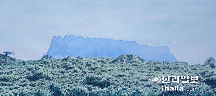일출봉의 높이는 해발 180m다. 그림을 그린 위치는 약 해발 90m 정도, 소실점이라고 할 수 있는 지평선이 일출봉의 허리 이하를 가려버렸다. 당연하게 바다도 등장하지 않는다. 일출봉과의 위치적 상관관계를 알지 못하는 사람이 이 그림을 보게 된다면 틀렸거나 이상한 그림이라고 생각할 것이다. 가을 햇살에 눈부신 무성한 목초지가 만들어낸 지평선이 일출봉의 높이를 가늠하는 척도가 될 수 있다는 사실에 흥미를 가지고 그렸다. 상투적으로 바라보는 일출봉이 아니라 상도리에서 목장지대로 가는 길에서 멀리 보이는 일출봉은 이러한 단순한 대비효과를 발생시킨다. 무엇을 그리느냐보다 어떤 의미를 풍경 속에서 발견하고 '자원화 할 수 있느냐' 고민하는 그림 작업이기에 이 장면을 목격하고 전율이 일었다. 전망대를 세워서 계단을 오르면 참으로 장엄한 모습이 교향악의 서곡처럼 시야에 펼쳐질 것이다. 좌우로 열리는 천으로 된 극장의 막이 아니라 땅 자체가 아래로 내려가며 펼쳐지는 무대가 연상되니 일출봉과 저 지평선 사이에 있는 숱한 아름다움이 저 지평선으로 인하여 그 가치를 극대화할 수 있겠거니. 가을날을 기다려 그리는 그림이 있다면 이런 것이다. 얇은 구름들이 은은하게 떠 있고 그 사이로 태양광선이 내리쬐면 멀리 일출봉과의 공간감이 더욱 신비롭게 와 닿는 상황을 만나야 하겠기에 그런 것이다. 엉뚱한 욕구가 일어난다. 일출봉과 저 지평선이 만나는 지점이 정확하게 절반 90m라는 사실을 측량으로 입증하고 싶은.