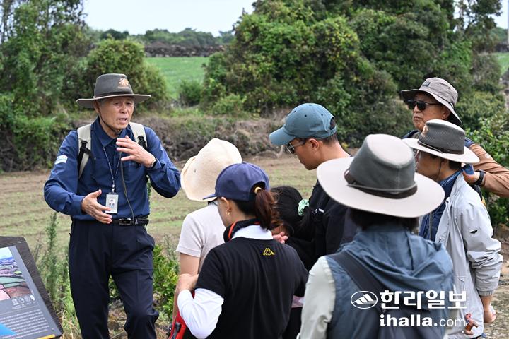 먼저 오정숙·고춘자 해설사는 김녕지역 밭을 가리키며 용암이 흘러간 흔적, 지역민들이 직접 돌을 깨고 쌓아 올려 밭담을 만들고 밭을 일군 역사를 설명했다.