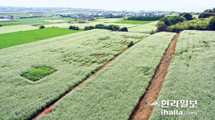 21일 제주시 한경면 고산리 들판에 하얀 메밀꽃이 활짝 피어났다. 소금을 흩뿌린 듯 희부연 메밀꽃들이 바람에 흔들리며 한 폭의 풍경화를 연출하고 있다. 강희만기자