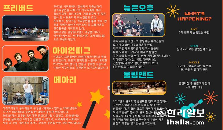 출연진은 5팀이다. 제주 자연과 사람을 노래하는 어쿠스틱 밴드 '늦은오후', 어쿠스틱·그룹사운드 연주 활동을 이어오고 있는 '프리버드', 서귀포시 효돈동에서 탄생한 얼터너티브 밴드로 강력한 사운드와 샤우팅을 들려줄 '아이언피그', 중문마을 밴드로 출발해 각종 행사에서 이름을 알리고 있는 '울림밴드', 서귀포시청 공직자들로 구성돼 '공무원 음악대전' 금상 수상 경력 등이 있는 '메아리'가 그들이다. 실용음악학원 원장과 강사, 악기점 사장, 교회 반주자, 학생 때부터 밴드 음악을 해온 교사, 공무원, 호텔리어 등 멤버들은 저마다 다른 일을 하고 있지만 음악에 대한 열정으로 만만치 않은 실력을 키워 왔다.