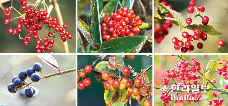 [한라일보] 시나브로 가을이 깊어간다. 하늘은 청명함을 더하고, 산과 들에는 오곡백과가 무르익는다. 22일 제주시 1100습지 탐방로에 각양각색의 나무 열매들이 매달려 깊어가는 가을을 웅변하고 있다. 사진 위 왼쪽부터 가막살나무 열매, 천남성 열매, 떨궝나무 열매, 사진 아래 왼쪽부터 쥐똥나무 열매, 청미래덩굴 열매, 빗살나무 열매. 강희만기자