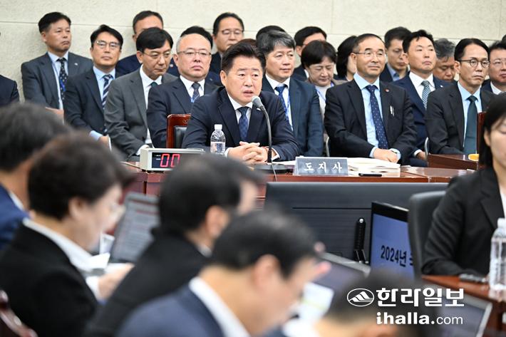 국회 행정안전위원회는 23일 제주자치도에 대한 국정감사를 실시했다. 오영훈 제주지사가 의원들의 질의에 답변하고 있다. 강희만 기자