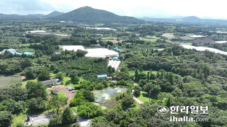 사진 하단부에 반못이 보이고 상단에 알바메기 오름이 솟아있다. 특별취재단