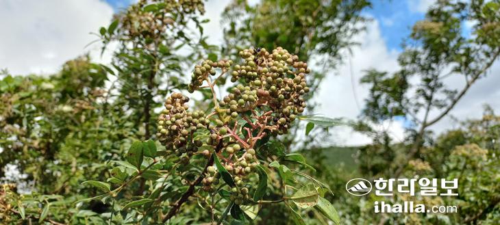족은지그리오름까지 찍고 바농오름으로 향한다. 바농은 바늘의 제주어다. 두릅, 상동, 청미래 등 가시나무가 많았나 보다. 삼나무숲을 치고 올라 정상에 서니 가막살 빨간 열매가 지천에 널려 있다. 바농오름 서쪽 기슭에는 4·3 당시 조천지역 주민들이 피신해 움막을 지었던 흔적이 희미하게 남아있다.