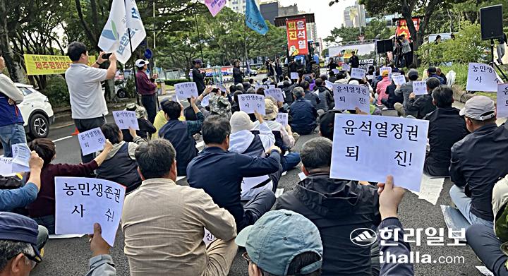 제주농민의 길은 25일 제주도청 앞에서 '제주농민대회'를 열어 "윤석열 정권을 내리고 농민생존권을 사수하자"고 목소리를 높였다.