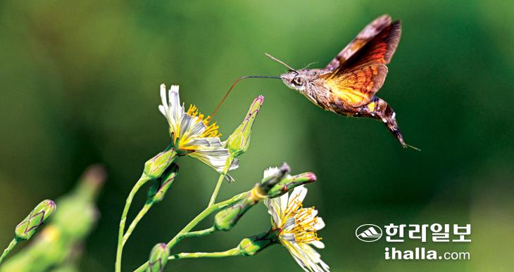 [한라일보] 28일 제주시 한경면 용수저수지 인근 공한지에 박각시나방이 왕고들빼기꽃에서 꿀을 따먹고 있다. 강희만기자