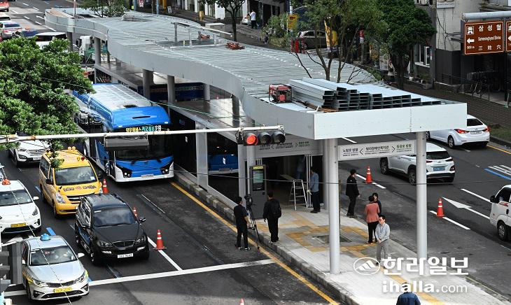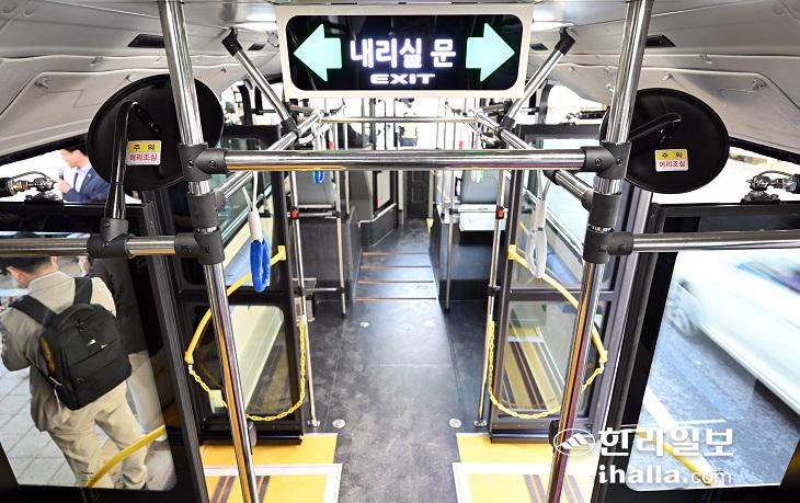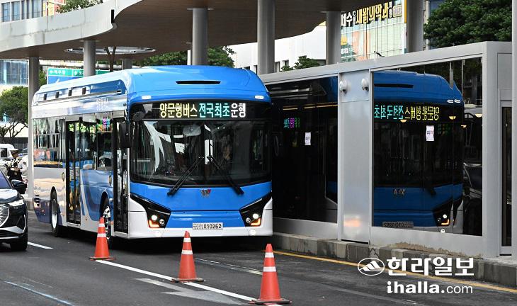 제주특별자치도가 29일 광양사거리 서측 탐라장애인복지회관 '섬식 정류장'에서 미디어데이를 열고 양문형 저상버스를 공개했다. 강희만기자
